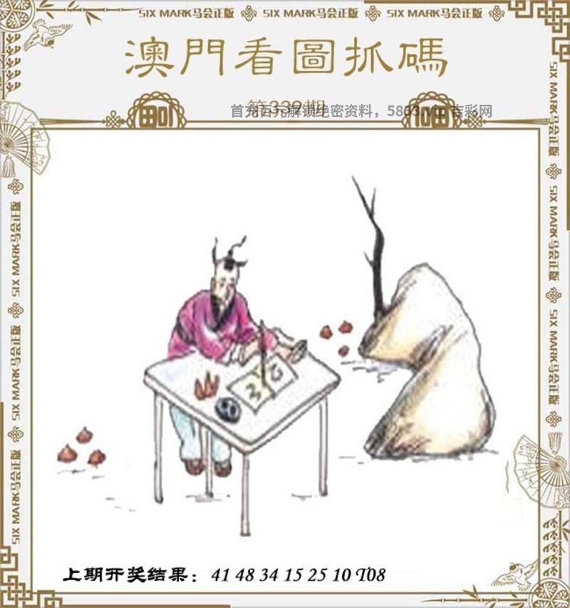 【妙解看图抓码】339期:图中有人物坐在桌前,手持毛笔,正在书写字,桌上有砚台和几支毛笔,背景有一块奇石和几堆小石头。